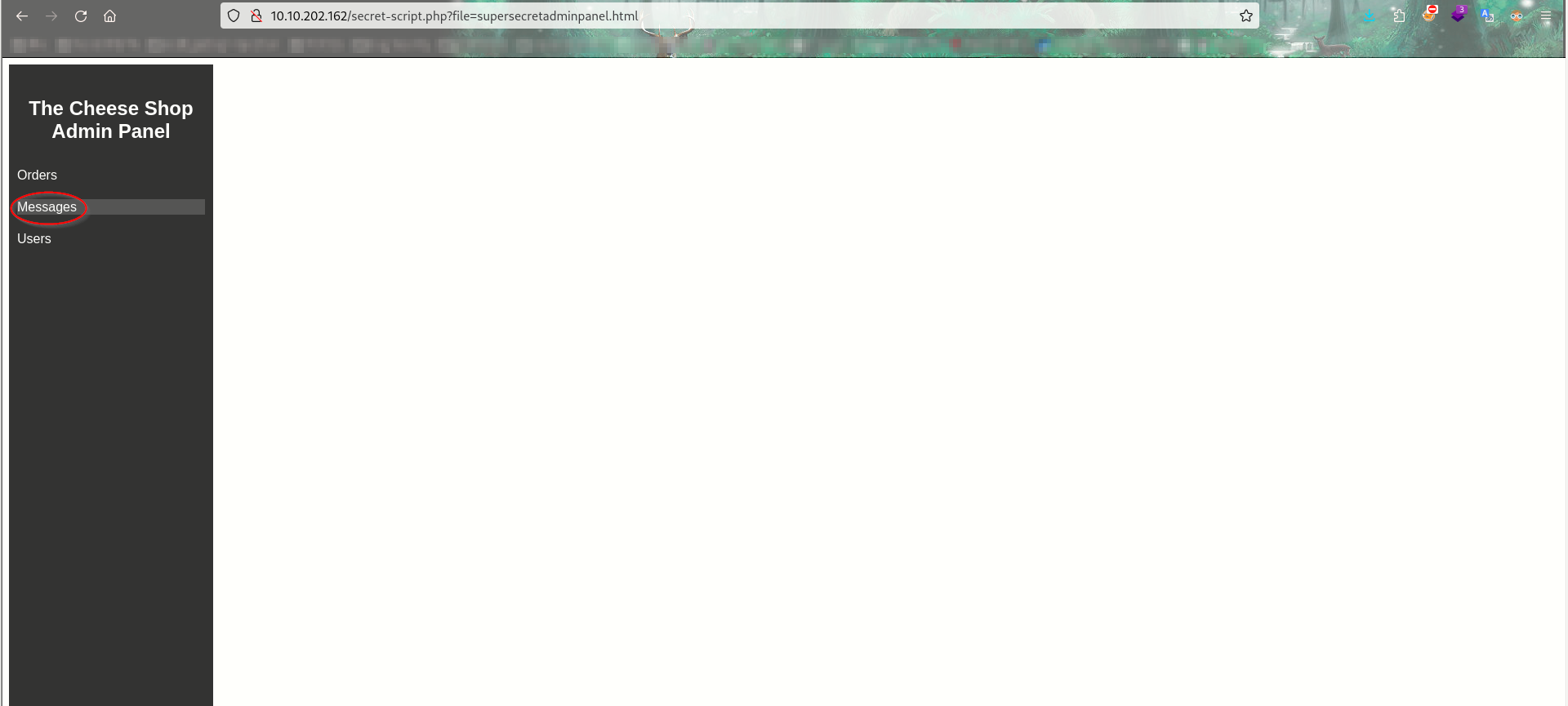 /secret-script.phpendpoint by fuzzing the web application for files, which revealsmessages.htmlthat links to it. Since there is no authentication mechanism, you can access it directly without logging in.