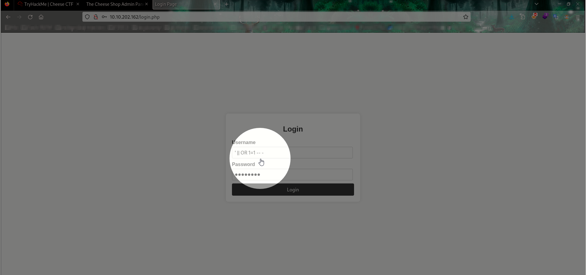 After trying a couple of simple SQL injection payloads, we are able to bypass the login using the payload ' || 1=1;-- - as the username.