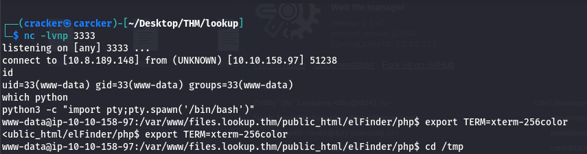 Finally, After gaining access through an elFinder RCE exploit, we obtain a limited shella foothold as a www-data user.
