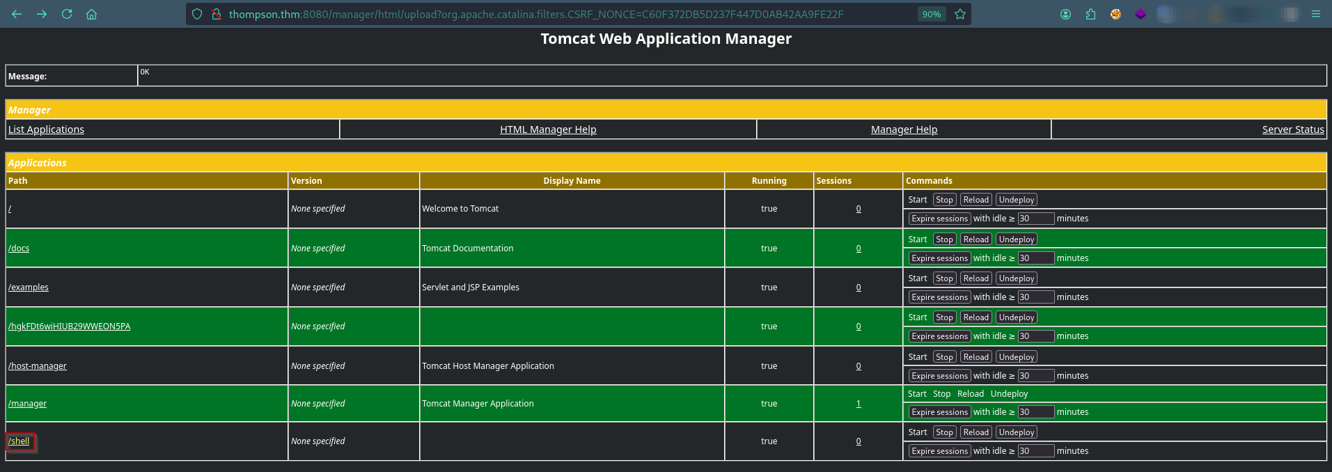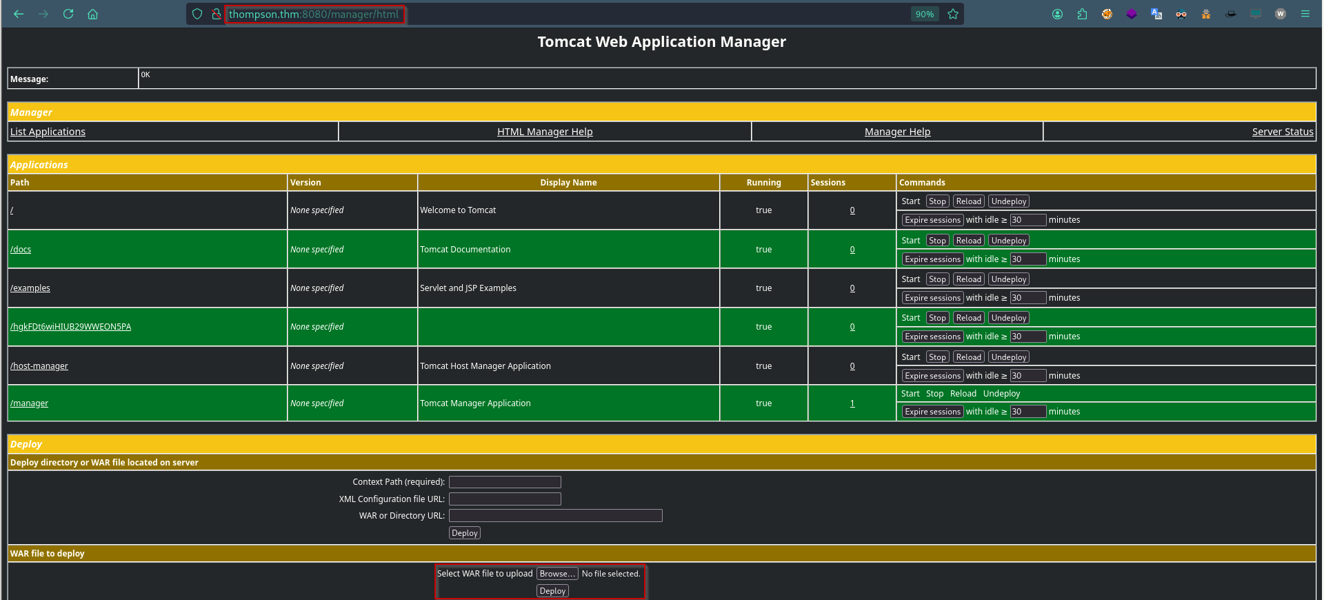 Now login to http://thompson.thm:8080/manager throw Credential tomcat:s3cret