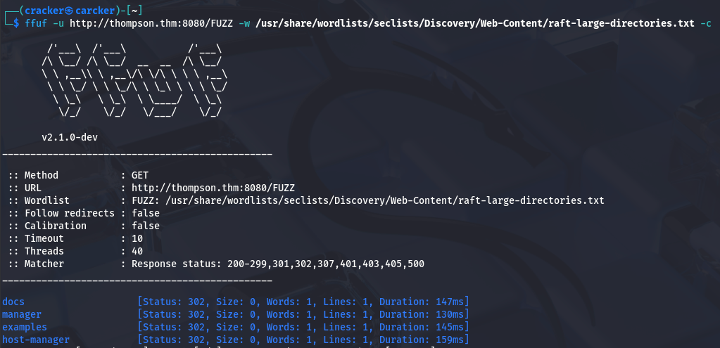 ffuf -u https://thompson.thm:8080/FUZZ -w /usr/share/wordlists/seclists/Discovery/Web-Content/raft-large-directories.txt -fc 403,402,404 -c